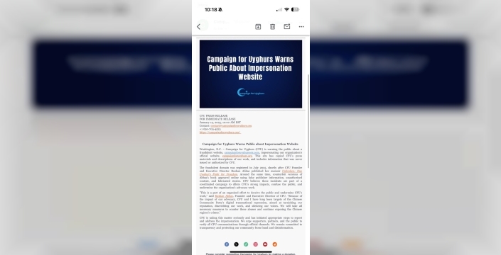 Uygur hareketine göre sahte site, *campaignforuyghurs.org* adresinin neredeyse birebir kopyası olarak karşımıza çıkıyor. Bu sahte sitede, örgütün gerçek yayınlarından alınan basın materyalleri ve açıklamalar yer alıyor. Örgüt, bu taklit sitede yayımlanan bilgilerin kendileri tarafından onaylanmadığını belirtiyor ve bunun halkı yanıltma amacı taşıdığını vurguluyor.