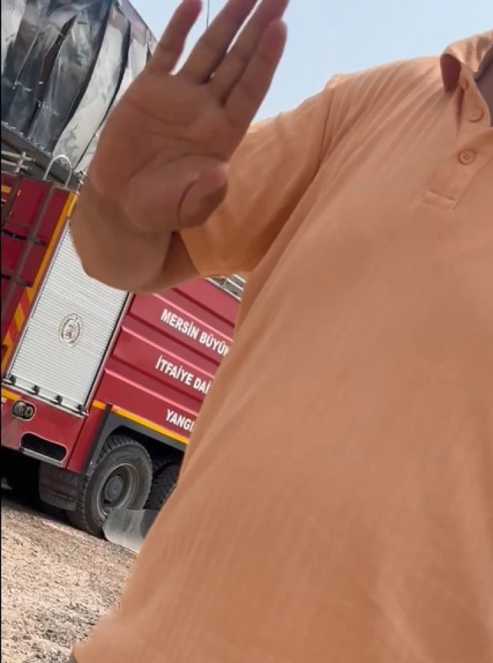 Mersinde bir depoda çıkan ve saatlerce süren mücadele sonrası söndürülen yangın bölgesinde çekim yapan gazetecilere,deponun sahibi olduğunu iddia eden şahı