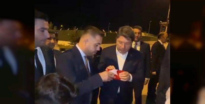 Adalet Bakanı Yılmaz Tunç, Hakkari ziyaretinin ardından Yüksekova'dan ayrılırken, Yüksekova Şehit Aileleri ve Gaziler Dayanışma Derneği Başkanı Sami Keskin tarafından kendisine sunulan Türk bayrağını öptü.Yüksekova'da anlamlı veda: Bakan Tunç, Türk bayrağını öptü