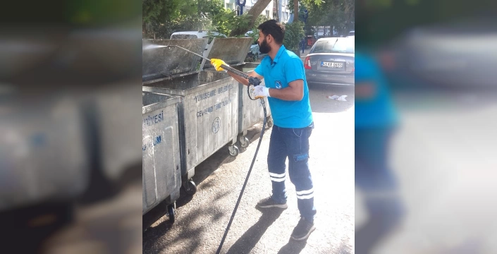 Yunusemre Belediyesi, yaz aylarındaki sıcaklıklar nedeniyle kötü koku ve çevre kirliliğini önlemek için çöp konteynerlerinin düzenli dezenfeksiyonunu sürdürüyor ve vatandaşlardan olumlu tepkiler alıyor.